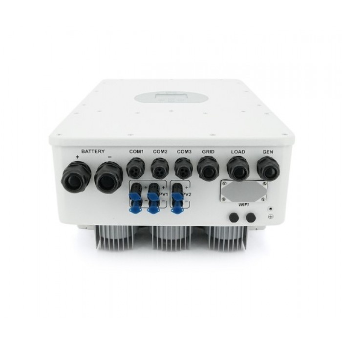 - Інвертор оснащений двома MPPT трекерами. Тому до інвертора можна підключати два окремі масиви сонячних панелей (східний та західний скат даху будинку чи монтаж частини панелей на даху, а частини на землі). Струм MPPT від панелей - 26А + 13А, а діапазон MPPT - від 200~650 В.